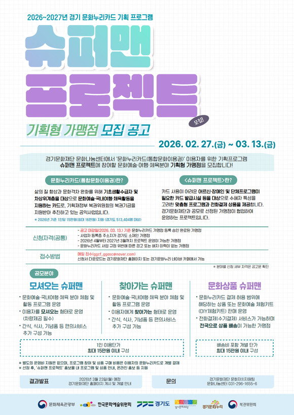 경기문화재단이 2026-2027년 경기지역 문화누리카드 기획 프로그램 <슈퍼맨 프로젝트>에 참여할 기획형 가맹점을 모집한다.