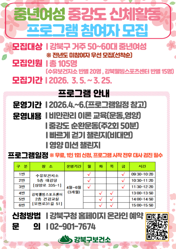 모집 대상은 강북구에 거주하는 1956~1976년생 여성 총 105명이다. 참여 신청은 5일부터 25일까지 강북구청 홈페이지 통합예약 시스템을 통해 선착순으로 진행된다. 프로그램은 4월 1일부터 6월 30일까지 12주간 운영되며, 수유보건지소와 강북웰빙스포츠센터에서 6개 반으로 나뉘어 주 2회, 회당 50분씩 중강도 운동을 실시한다.