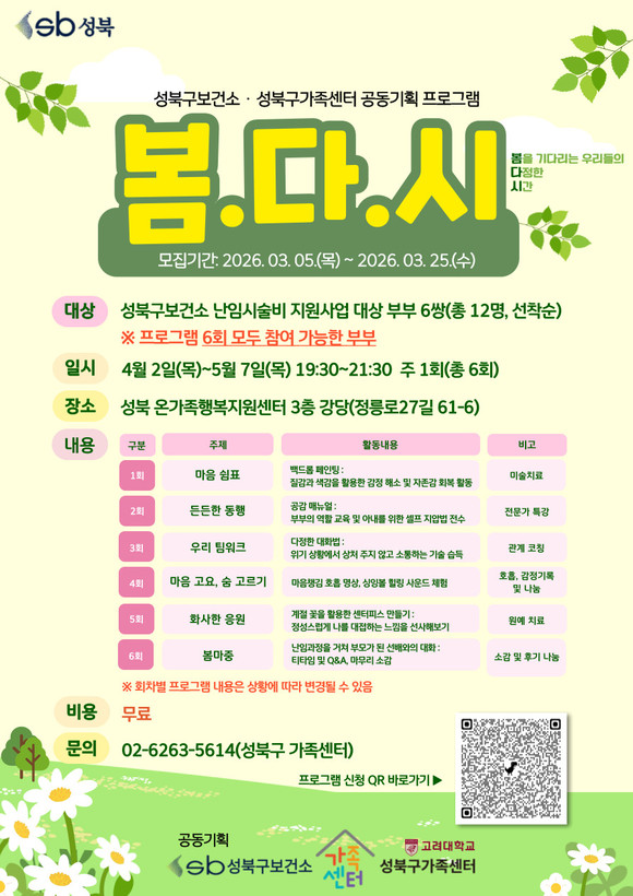 프로그램은 4월 2일부터 5월 7일까지 매주 목요일 오후 7시 30분부터 9시 30분까지 총 6회에 걸쳐 성북 온가족행복지원센터(정릉로 27길 61-6)에서 무료로 진행된다.