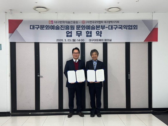 (재)대구문화예술진흥원(이하 진흥원, 원장직무대행 황보 란) 문화예술본부(본부장 방성택)과 대구국악협회(협회장 김신효, 이하 ‘국악협회’)가 3월 23일(월) 업무협약을 체결했다.