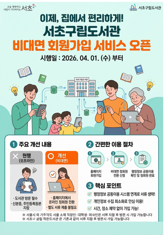비대면 회원가입은 서울시에 거주하는 시민이라면 누구나 이용할 수 있다. 다만, 서울 소재 직장 재직자나 학교 재학생 등의 경우 개인정보 관련 증빙서류 확인을 위해 기존과 동일하게 도서관 방문을 통한 정회원 전환만 가능하다. 구는 노약자·영유아 등 스마트기기 이용이 어려운 이용자를 위해 도서관 방문 시 직원 안내를 받아 회원증을 발급받을 수 있는 현장 발급 서비스도 계속 유지할 계획이다. 자세한 사항은 서초구립도서관 홈페이지를 확인하거나 서초구청 도서관팀으로 문의하면 된다.