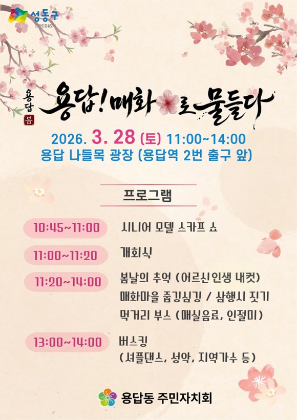 이번 행사는 용답동 주민자치회 주최로 청계천 인근 ‘용답 매화 마을’의 지역적 가치를 알리고, 유아부터 어르신까지 함께 어울릴 수 있는 만남과 소통의 장을 마련하기 위해 기획됐다.