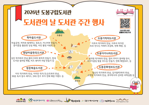 서울 도봉구(구청장 오언석)가 도봉문화재단 도봉구립도서관에서 도서관의 날(4월 12일)과 도서관 주간(4월 12~18일)을 맞아 다양한 독서문화 행사를 진행한다.