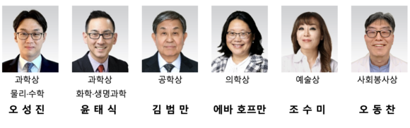 과학상 물리·수학 부문 수상자인 오성진 미국 UC버클리 교수는 블랙홀 내부의 물리적 불안정성을 수학적으로 규명해 난제 해결의 돌파구를 제시한 공로를 인정받았다. 화학·생명과학 부문 윤태식 미국 위스콘신대 매디슨 교수는 가시광선을 활용한 친환경 유기합성 방법론을 개발해 화학 분야 패러다임 전환을 이끌었다.