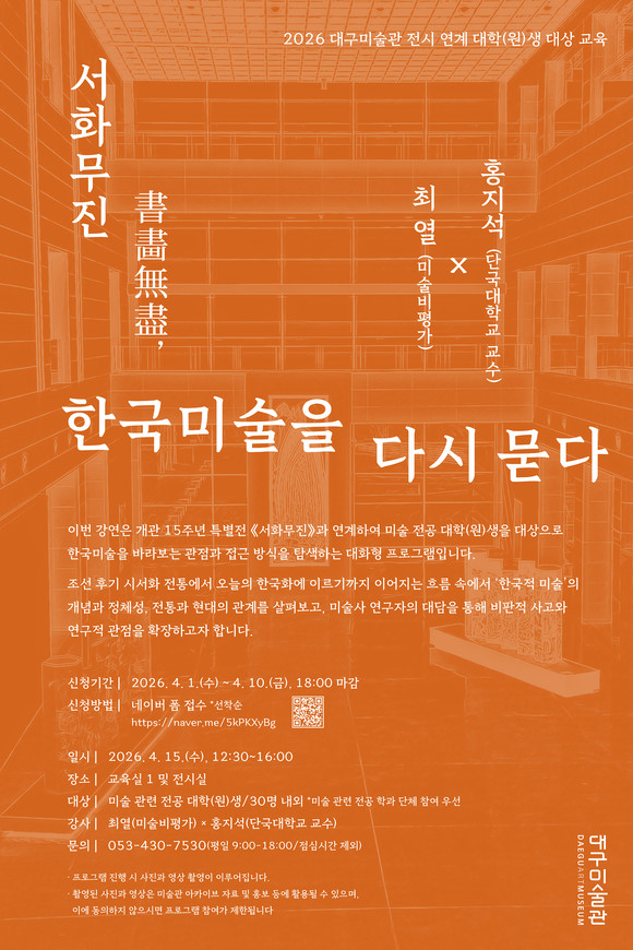 대구미술관 관계자는 “이번 프로그램은 전시를 기반으로 한국미술을 바라보는 다양한 관점과 해석을 공유하는 자리로, 전공자들을 위한 심화 교육을 통해 한국미술을 바라보는 시각을 확장하는 계기가 될 것으로 기대한다”라고 밝혔다.