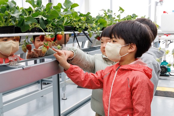 어린이들이 ‘마포 스마트팜 체험관’에서 자라는 딸기를 관찰하고 있다. 사진=마포구청