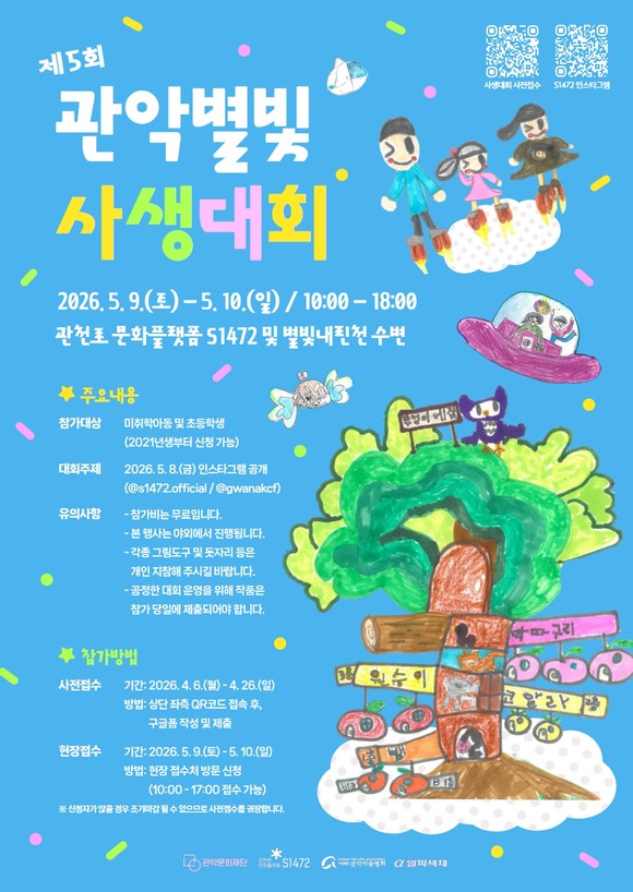 제5회 관악별빛사생대회 사전 접수와 2026 S1472 어린이주간 행사에 대한 자세한 내용은 관악문화재단 홈페이지에서 확인할 수 있으며, 관련 문의는 관악문화재단 창의예술팀으로 하면 된다.