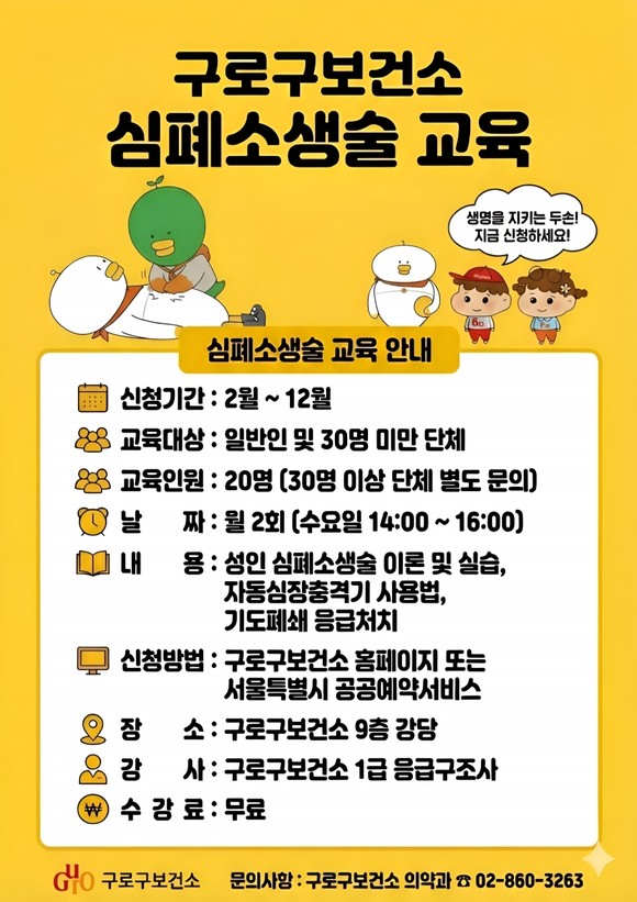 교육 신청은 구로구보건소 누리집 또는 서울특별시 공공예약서비스에서 가능하며, 교육비는 전액 무료다. 다만 신청 인원이 5명 미만일 경우 일정이 변경될 수 있다.