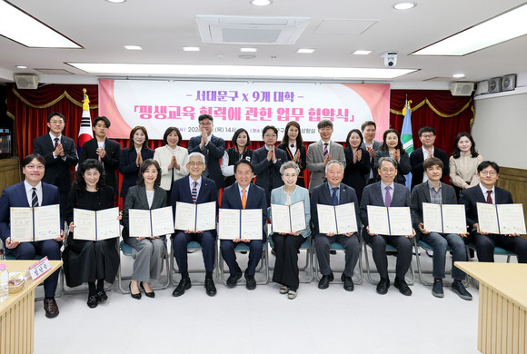 서울 서대문구(구청장 이성헌)는 최근 구청 기획상황실에서 지역 내 9개 대학과 함께 ‘평생교육 협력에 관한 업무협약’을 체결하고 지역사회와 대학이 상생하는 ‘지속 가능한 평생학습 체계 구축’에 나섰다고 8일 밝혔다.