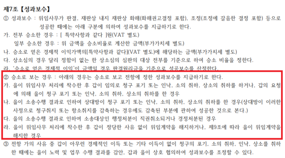 문제는 일반적인 위임계약서에도 의뢰인의 소 취하나 상대방의 청구 포기, 상호 합의에 따른 종결까지도 ‘승소’로 간주하는 이른바 ‘승소간주조항’이 포함돼 있다는 점이다. 대한변호사협회 표준 사건위임계약서 역시 승소간주조항을 인정하고 있다.