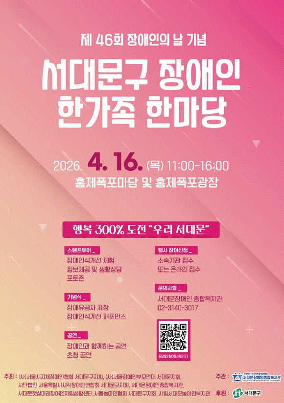 서울 서대문구(구청장 이성헌)는 이달 16일 오전 11시부터 오후 4시까지 홍제폭포광장 및 홍제폭포마당 일대에서 ‘서대문구 장애인 한가족 한마당’이 열린다고 밝혔다.