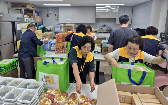 협의체 위원들은 꾸러미에 치약, 칫솔, 비누, 세탁세제, 샴푸, 티슈, 사과, 배, 김, 송편 등을 정성껏 담았다.