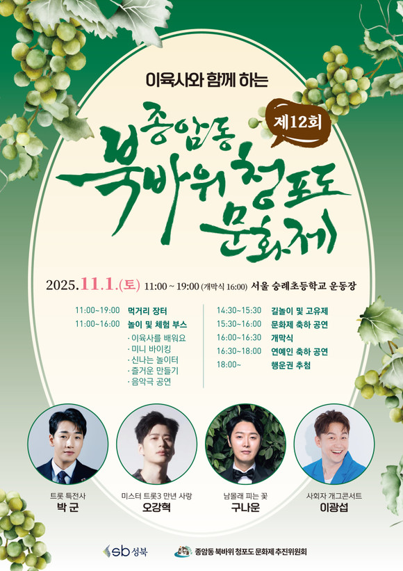 서울 성북구 종암동 북바위·청포도 문화제 추진위원회가 오는 11월 1일 서울숭례초등학교 운동장에서 「제12회 종암동 북바위·청포도 문화제」를 개최한다.