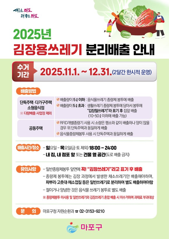 서울 마포구(구청장 박강수)는 본격적인 김장철을 맞아 11월 1일부터 12월 31일까지 한시적으로 ‘김장용 쓰레기 특별 수거기간’을 운영한다.