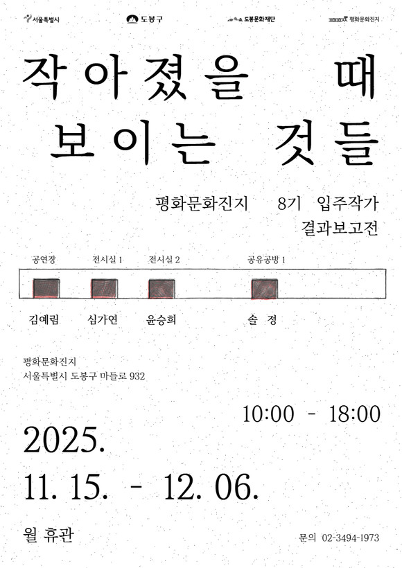 이번 전시에는 김예림, 심가연, 윤승희, 정솔 작가가 참여했다. 작가들은 올해 1월 평화문화진지에 입주해 작품 창작활동뿐만 아니라, ‘상·하반기 오픈스튜디오’, ‘2025 도봉문화이음제’ 등 다양한 프로그램에 참여하며 예술교육을 매개로 구민들과 소통했다.