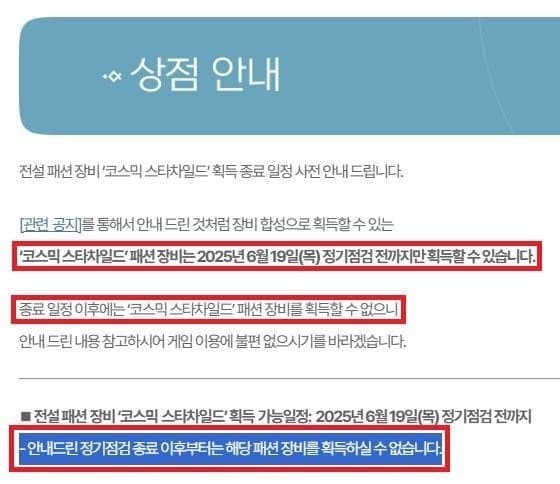 앞서 넥슨은 전설 패션장비 ‘코스믹 스타차일드’, ‘엘더우드 소버린’ 판매 당시 “정기점검 전까지만 획득할 수 있다”, “종료 일정 이후에는 획득할 수 없다”, “안내드린 정기점검 종료 이후부터는 해당 패션 장비를 획득할 수 없다”는 확정적 표현을 반복 사용했다.