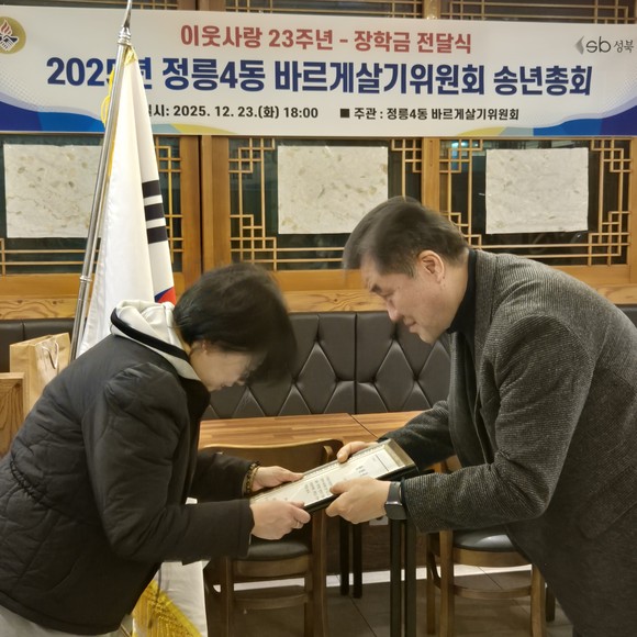 백종식 정릉4동 바르게살기위원회 위원장은 “경기 침체와 겨울 한파로 모두가 어려운 시기지만, 이웃들이 조금이나마 따뜻한 겨울을 보낼 수 있기를 바라는 마음에서 장학금을 마련했다”며 “미래세대가 경제적인 이유로 꿈과 희망을 잃지 않도록 돕는 일이 무엇보다 뜻깊다”고 말했다.