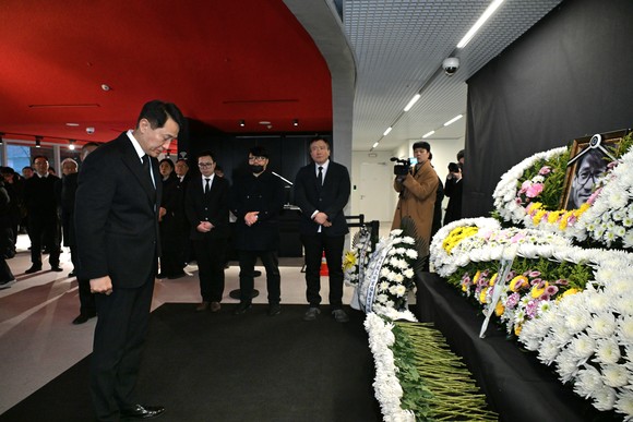 오세훈 서울시장이 6일(화) 충무로 서울영화센터에 마련된 고(故) 안성기 배우 추모공간을 찾아 헌화 후 묵념하고 있다. 사진=서울시청