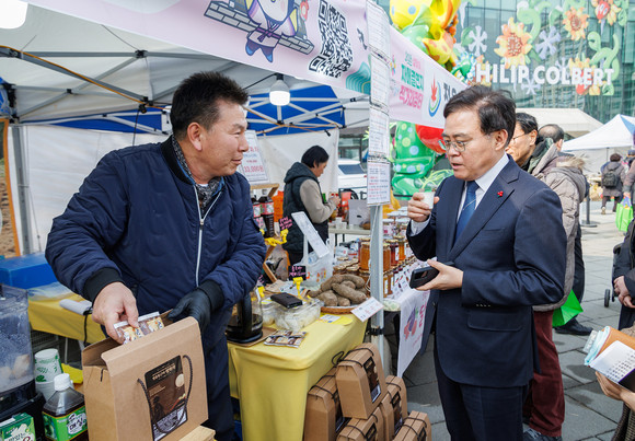 진교훈 서울 강서구청장이 5일(목) 마곡광장에서 열린 ‘설맞이 농특산물 직거래장터’를 찾았다.
