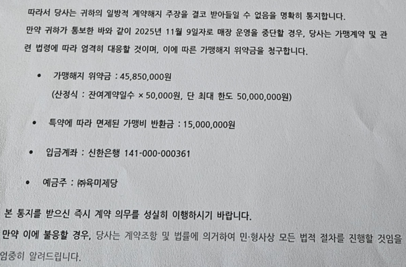 통지서에는 지정 계좌로의 즉시 입금을 요구하는 문구와 함께, 불이행 시 민·형사상 모든 법적 절차를 진행하겠다는 취지의 경고성 표현도 포함돼 있었다. 본사는 해당 영업 중단을 ‘일방적 계약 위반’으로 규정하며, 계약서 조항에 따른 위약금 청구의 정당성을 주장하고 있다.