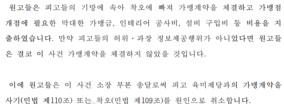 원고 측은 이 같은 사정을 종합할 때 계약 체결의 전제가 된 사실관계가 허위 또는 과장된 정보에 기반했으므로 가맹계약은 취소돼야 하며, 이에 따른 가맹점주들의 손해를 가맹본부가 배상해야 한다고 주장하고 있다.