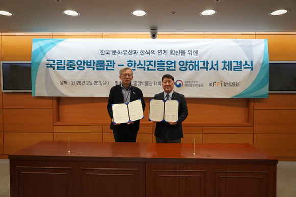 국립중앙박물관(관장 유홍준)과 한식진흥원(이사장 이규민)은 2월 25일 국립중앙박물관에서 양해각서를 체결했다. 이번 협약은 케이-컬처의 두 축인 문화유산과 한식의 연계를 통해 통합적인 홍보 효과를 극대화하고, 국민에게 더욱 풍성한 문화 향유 기회를 제공하기 위해 마련되었다.
