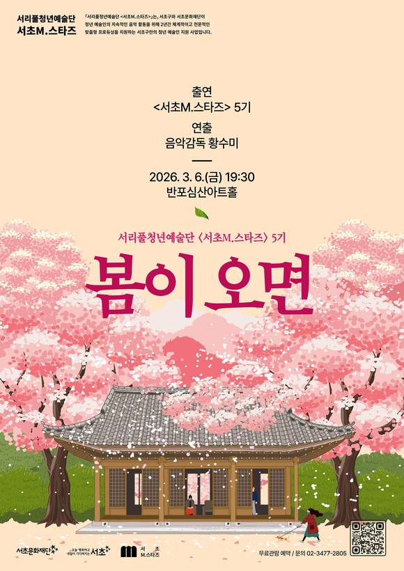 서울 서초구(구청장 전성수)와 서초문화재단은 오는 3월 6일(금) 오후 7시 30분 반포심산아트홀에서 서리풀청년예술단 ‘서초M.스타즈 5기’의 기획공연인 한국 가곡 콘서트 <봄이 오면>을 개최한다고 밝혔다.