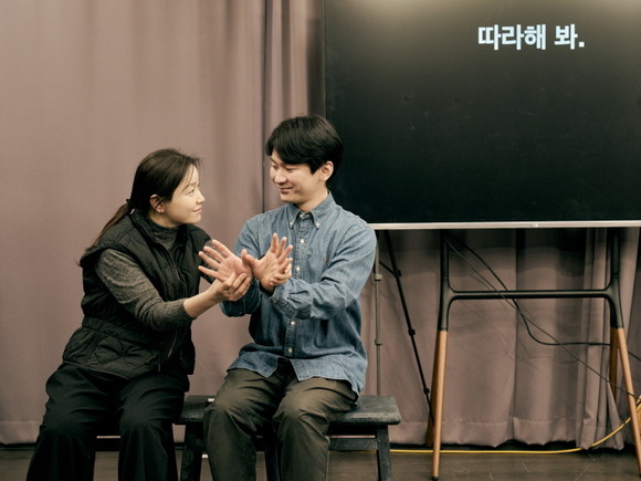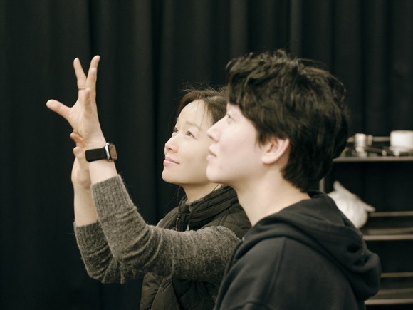 ‘모미’ 역의 정운선과 강해진 배우는 한 작품 안에서 다섯 개의 캐릭터를 오가며 장면을 연습하고 있다. ‘모미’를 비롯해 장례식장을 관리하며 로비스를 지켜보는 ‘무영’, 박도해의 아들이자 가정부 안드로이드 ‘박동구’, 발레리나 레나의 언니이자 우주비행사 ‘첼’, 어린 아들을 떠나보낸 엄마 ‘수연’까지, 배우들은 인물마다 감정선과 관계를 분명히 구분하며 장면의 리듬을 정교하게 다듬는다. 이 과정에서 각 인물의 관계와 감정을 더욱 선명하게 이끌어내며 극의 몰입감을 더한다.