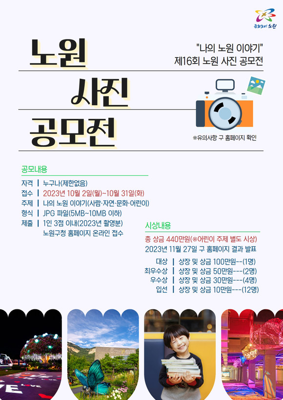앞서 밝힌 대로 공모 주제는 ‘나의 노원 이야기’다. 노원의 사람, 자연, 문화를 담은 사진을 공유하고 싶은 특별한 순간이면 된다. 특히, 올해는 ‘노원의 어린이’라는 인물사진 주제를 신설해 출산 장려 차원에서 별도의 시상이 이뤄진다.