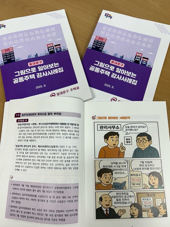 이필형 동대문구청장은 “이번 사례집은 단순히 감사지적 내용을 나열하는 데 그치지 않고, 공동주택에 관심 있는 누구나 쉽게 보고 웃으면서 배울 수 있도록 구성한 첫 시도”라며 “앞으로도 주민 눈높이에 맞는 쉽고 정확한 행정정보 제공을 위해 AI 행정을 꾸준히 확대해 나가겠다.”라고 밝혔다.