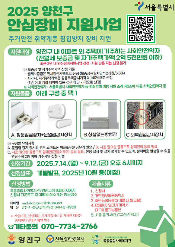 서울 양천구(구청장 이기재)는 사회안전약자를 대상으로 실질적인 방범 보호장치를 제공해 생활 안전망을 강화하고자 ‘주거안전 취약계층 침입방지 장비 지원사업’을 올해부터 새롭게 도입하고, 오는 9월 12일까지 신청자를 모집한다고 밝혔다.