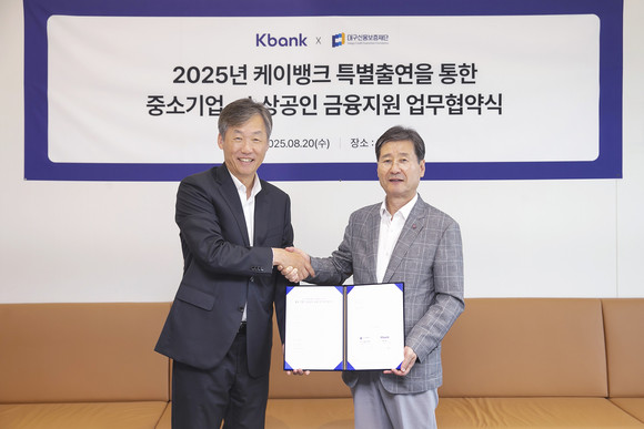 케이뱅크는 최우형 은행장과 박진우 대구신용보증재단 이사장이 참석한 가운데 을지로 사옥에서 ‘2025년 케이뱅크 특별출연을 통한 중소기업·소상공인 금융지원 업무협약’을 체결했다고 21일 밝혔다.