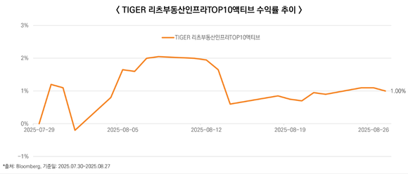 미래에셋자산운용은 지난 7월 29일 상장된 국내 유일 액티브 리츠 ETF인 TIGER 리츠부동산인프라TOP10액티브의 상장 1개월 성과와 첫 분배 계획을 29일 공개했다.