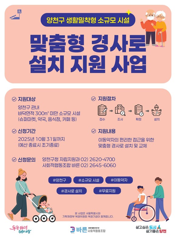 서울 양천구(구청장 이기재)는 장애인·노약자·임산부·어린이 등 이동약자의 접근 편의를 높이기 위해 ‘생활밀착형 소규모시설’ 경사로 무상설치 지원사업을 추진하고, 10월 31일까지 신청자를 모집한다고 밝혔다.