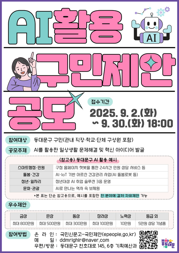 서울 동대문구(구청장 이필형)는 구민들의 창의적인 아이디어를 구정에 반영하기 위해 9월 2일부터 30일까지 「AI 구민제안 집중공모」를 진행한다고 밝혔다.