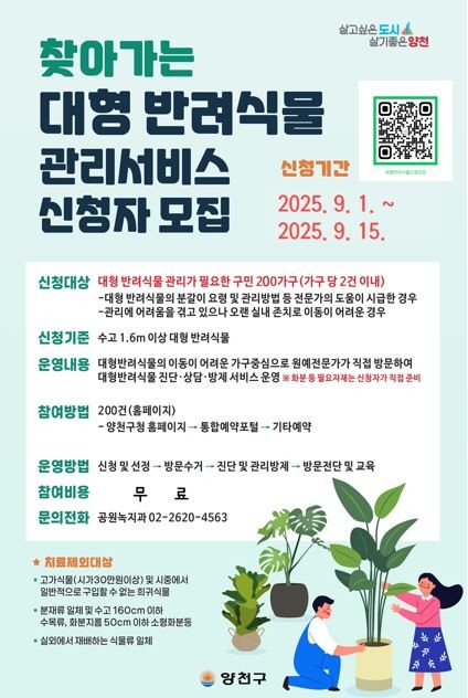 이기재 양천구청장은 “반려식물은 정서적 안정과 일상에 활력을 주지만, 여러 가지 여건으로 관리에 어려움을 겪는 구민에게는 또 하나의 부담이 될 수 있다”며, “이번 찾아가는 대형 반려식물 관리서비스가 생활 속 작은 행복을 회복하는 계기가 되길 바란다”고 말했다.