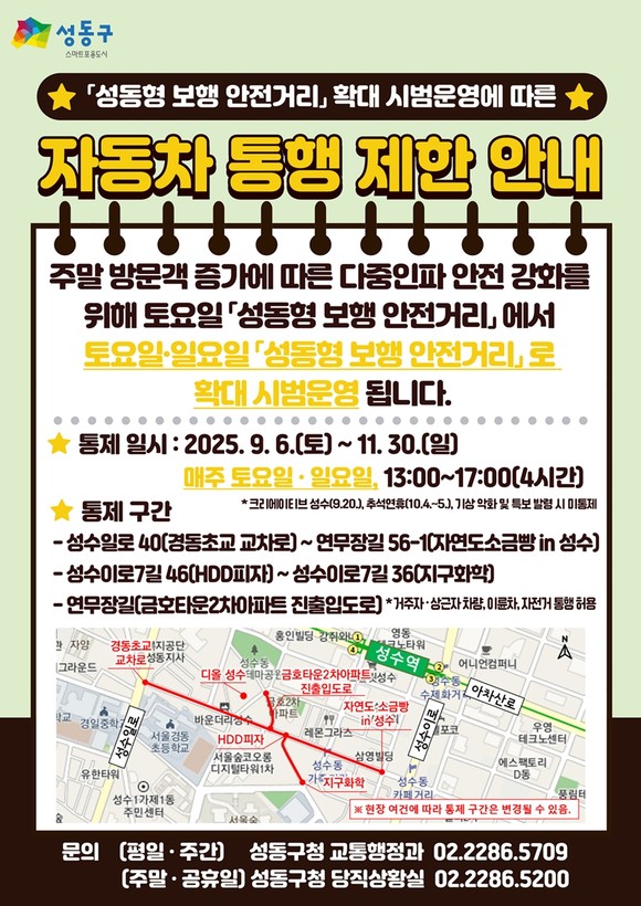 아울러, 9월 20일에는 성수동 전역에서 열리는 ‘크리에이티브X성수’ 축제의 안전한 진행을 위해 성수역 3번 출구와 대림창고 일대 성수이로는 오전 8시부터 오후 10시까지, 연무장길은 오후 1시부터 오후 6시까지 차량 통행이 통제될 예정이다.