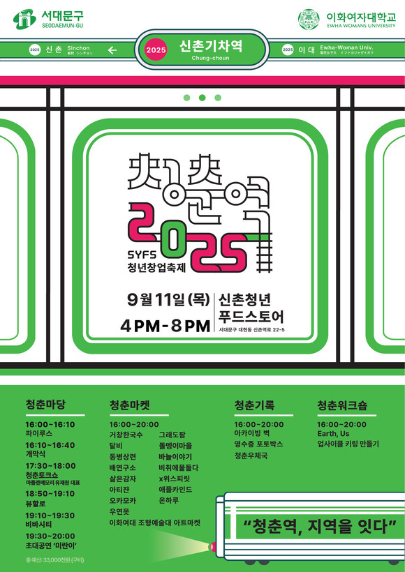 서울 서대문구(구청장 이성헌)가 이달 11일 오후 4∼8시 신촌 청년푸드스토어(신촌역로 22-5)에서 이화여대와 함께 ‘청춘역 2025’를 개최한다.