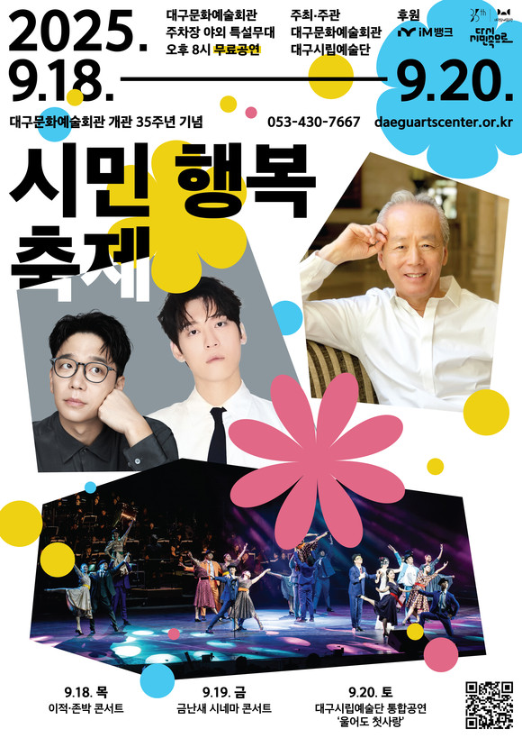 대구문화예술회관은 개관 35주년을 맞아 ‘다시 시민 속으로’라는 슬로건을 내걸고 오는 9월 18일부터 20일까지 3일간 야외 특설무대에서 〈시민행복축제〉를 개최한다. 이번 축제는 시민과 소통하며 교류하는 열린 공연 축제로 기획됐다.
