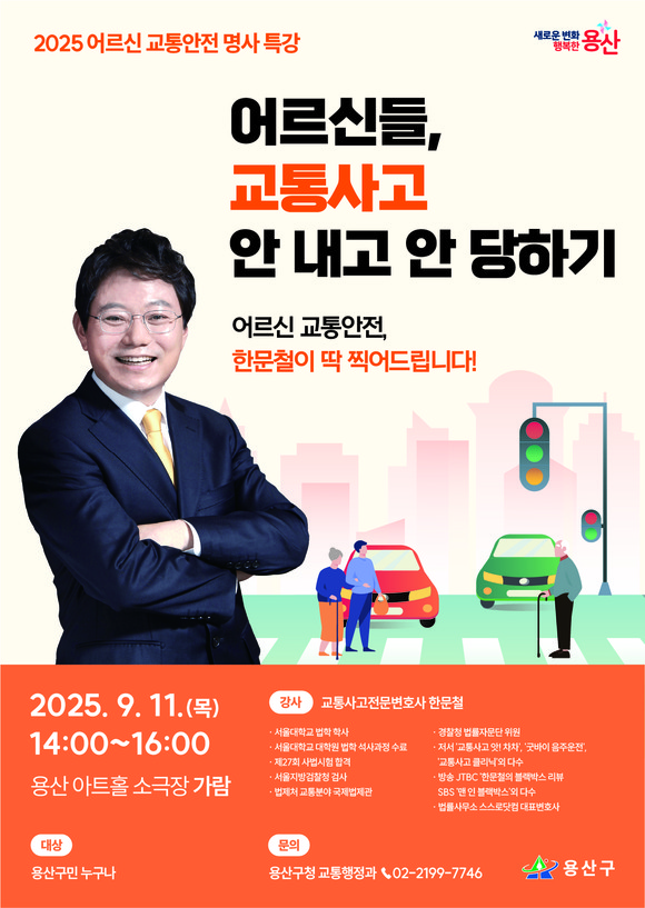 서울 용산구(구청장 박희영)는 오는 9월 11일 오후 2시 용산아트홀 가람에서 『어르신 교통안전, 한문철이 딱 찍어드립니다!』라는 주제로 명사 특강을 개최한다. 이번 특강은 교통사고에 특히 취약한 어르신들의 안전을 지키고, 지역사회 전반에 교통안전 문화를 확산하기 위해 마련됐다.