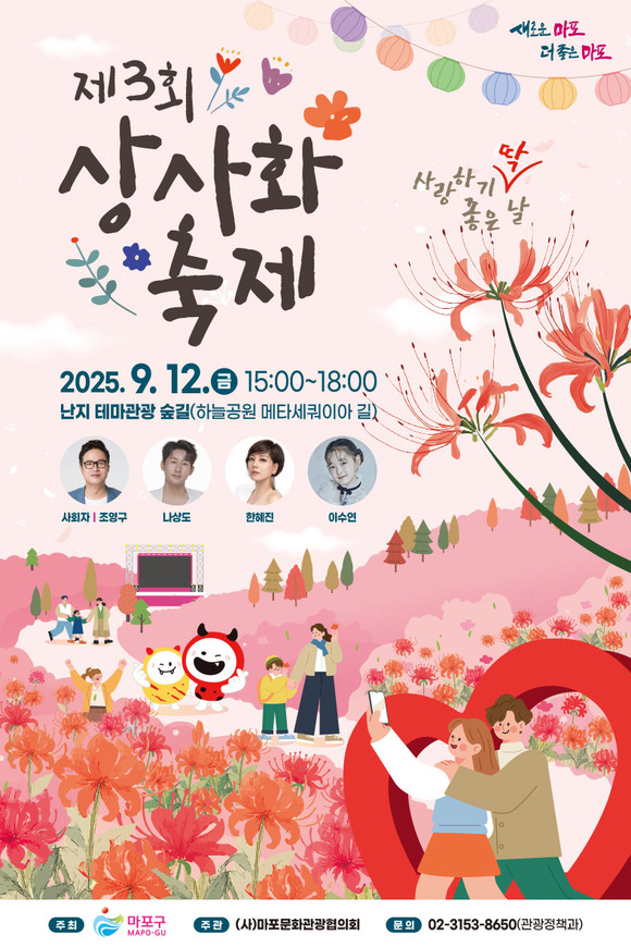 서울 마포구(구청장 박강수)는 9월 12일 난지 테마관광 숲길에서 ‘사랑하기 딱 좋은 날’이라는 주제로 (사)마포문화관광협의회 주관 ‘제3회 마포구 상사화 축제’를 개최한다.