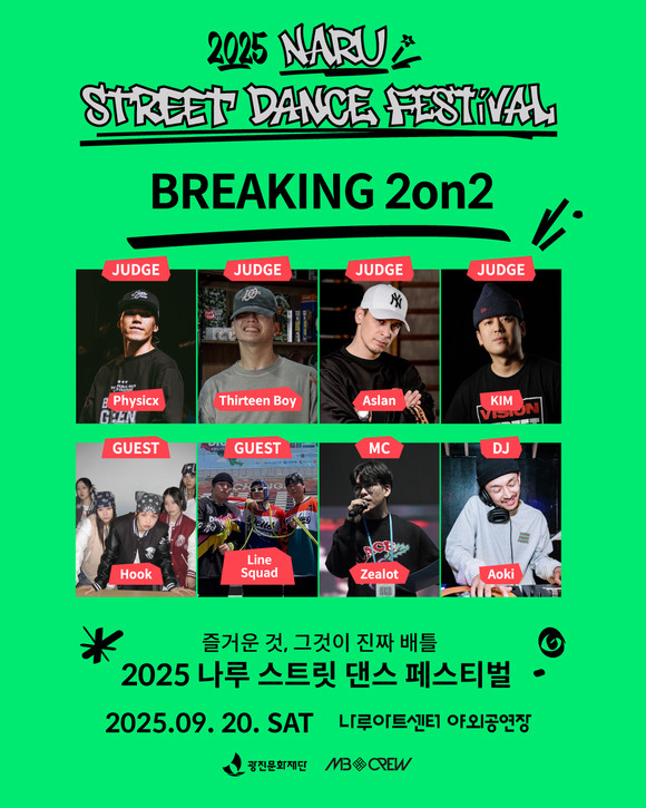 총 우승 상금 1천 5백만원(1,500만원)을 두고 펼치는 <2025 나루 스트릿 댄스 페스티벌>은 9월 20일(토) 브레이킹, 21일(일) 오픈 스타일 장르 2대2 배틀로 각각 진행되며, 전 세계를 무대로 활동 중인 대한민국 대표 댄서들이 심사위원 및 게스트로 참여한다.