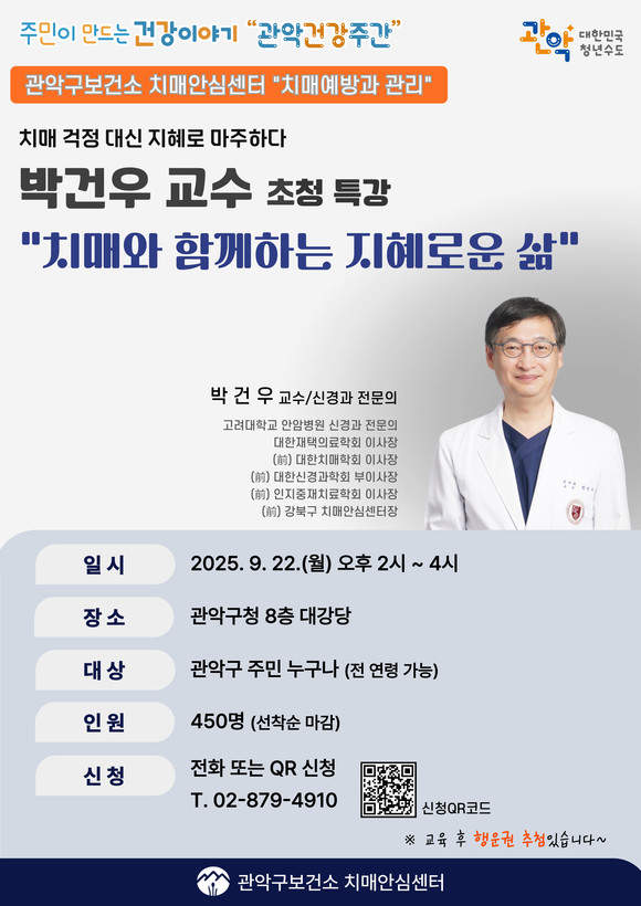 이번 특강은 고려대학교 안암병원 신경과 박건우 교수를 초청해 ‘치매와 함께하는 지혜로운 삶’이라는 주제로 치매의 예방과 관리방법 등을 주민들이 알기 쉽게 강연한다.