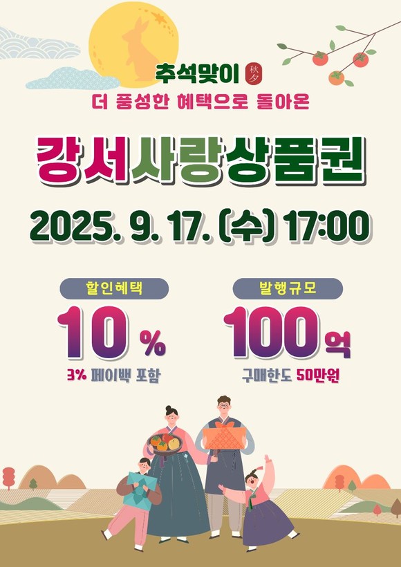 서울 강서구(구청장 진교훈)는 오는 17일 ‘서울강서사랑상품권’을 총 100억 원 규모로 발행한다고 밝혔다.