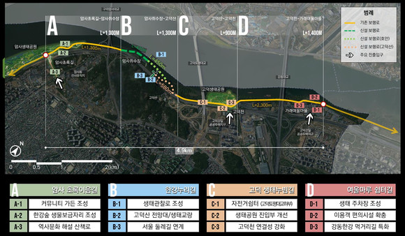 또한, 구는 암사생태공원에서 가래여울마을까지 4개 구간(A~D 구간)으로 나누어, 각 구간의 특성과 강점을 살린 전략으로 12개 실행 과제를 수립했다.