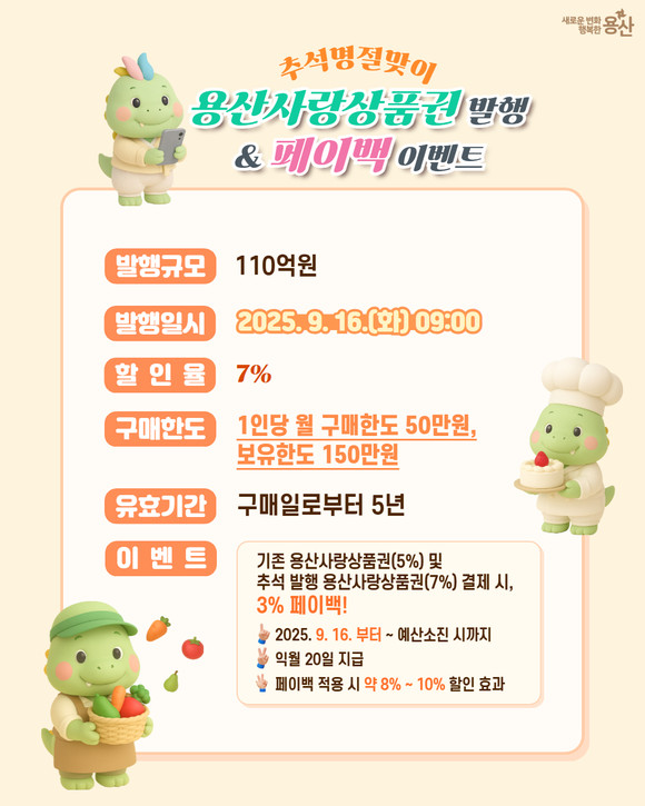서울 용산구(구청장 박희영)는 추석 명절을 맞아 오는 9월 16일 오전 9시, ‘용산사랑상품권’ 110억 원을 발행한다고 밝혔다. 상품권은 ‘서울페이플러스(서울PAY+) 앱을 통해 구매할 수 있으며, 용산구 내 서울페이 가맹점에서 사용 가능하다.