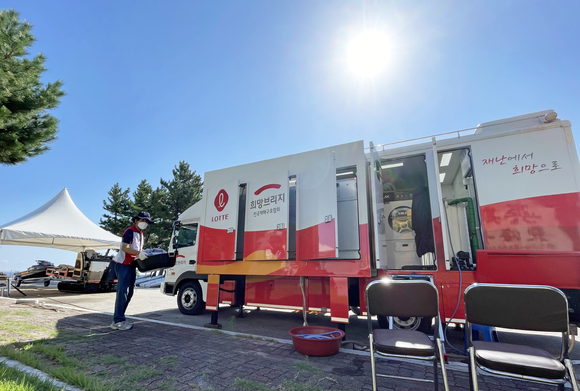 이번 세탁구호 현장에는 롯데그룹의 후원으로 제작된 5.5톤 규모의 특수 이동형 세탁차량이 투입됐다. 차량에는 18kg 대형 세탁기 3대와 23kg 대형 건조기 3대가 탑재돼 있으며, 하루 8시간 기준 약 1000kg의 의류와 이불 등을 현장에서 직접 세탁·건조할 수 있다.