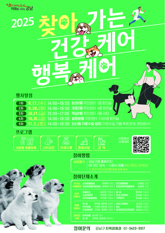 서울 강남구(구청장 조성명)가 반려동물과 사람이 함께 사는 건강한 도시를 만들기 위해, 9월부터 11월까지 ‘찾아가는 건강케어 행복케어’ 반려견 복지 서비스를 운영한다.