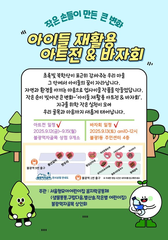 재활용 아트전은 자연과 환경을 아끼는 아이들의 꿈을 응원하고 침체된 지역 상권에 활력을 불어넣기 위해 마련됐다. 불광먹자골목 상인회는 상점가 내 전시 공간을 제공하고 꼼지락공동체와 협력해 지역과 어린이가 어우러지는 장을 만드는 데 힘을 보탰다.