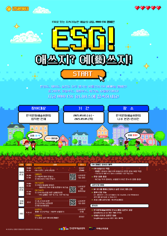 한국문화예술위원회(위원장 정병국, 이하 아르코(ARKO))는 지난 9월 3일부터 4일까지 전 임직원을 대상으로 「ESG! 애쓰지? 예(藝)쓰지!」 캠페인을 성황리에 개최했다고 밝혔다. 이번 캠페인은 ‘ESG로 잇는 지속가능한 예술의 내일’을 주제로, 교육존·체험존·소비존·워크숍 등 다양한 프로그램을 통해 임직원들의 ESG 실천 문화를 생활 속으로 확산하는 데 목적을 두었다.
